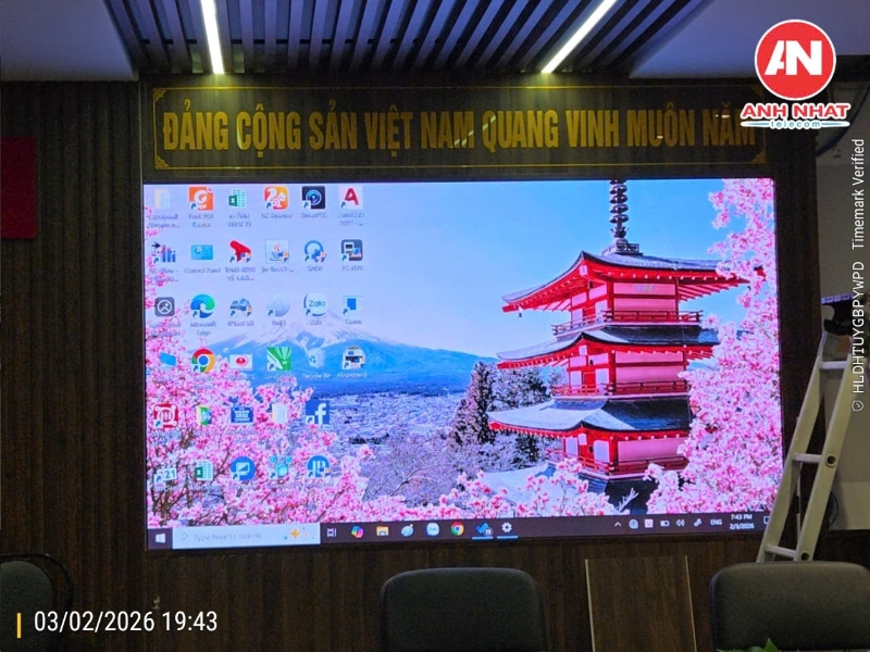 Quá trình thi công được thực hiện theo chuẩn kỹ thuật để đảm bảo an toàn và tính thẩm mỹ cho toàn bộ phòng họp. Đầu tiên, màn hình LED 120 inch được lắp đặt đúng kỹ thuật, cố định chắc chắn vào vị trí trung tâm, đồng thời căn chỉnh độ cao để đảm bảo khả năng quan sát tối ưu cho toàn bộ người tham dự.